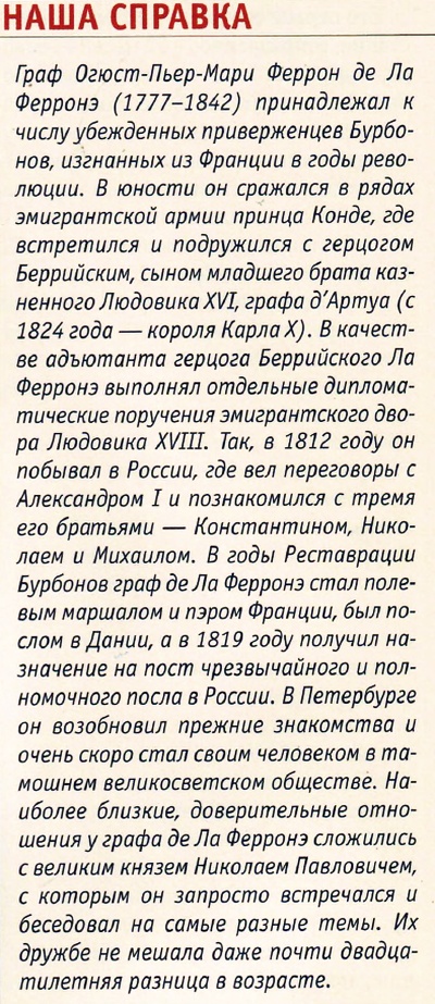 Что же касается Ла Ферронэ, то он оставался на своем посту в России до конца 1827 года, когда был отозван в Париж, чтобы возглавить Министерство иностранных дел Франции. В начале 1830 года Карл X назначил графа своим послом в Риме, где того и застала Июльская революция, окончательно свергнувшая Бурбонов. Убежденный легитимист, граф де Ла Ферронэ отказался присягнуть "королю-гражданину" Луи Филиппу и вышел в отставку. Он умер в добровольном изгнании в Риме 17 января 1842 года. Венценосный русский друг пережил его на тринадцать лет.