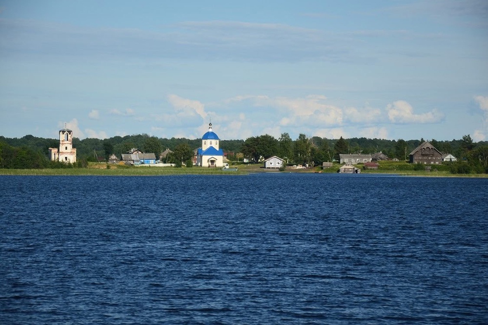 Пейзаж с видом храма Святого Николая Чудотворца в селе Сенная Губа на снимке 1978 года.