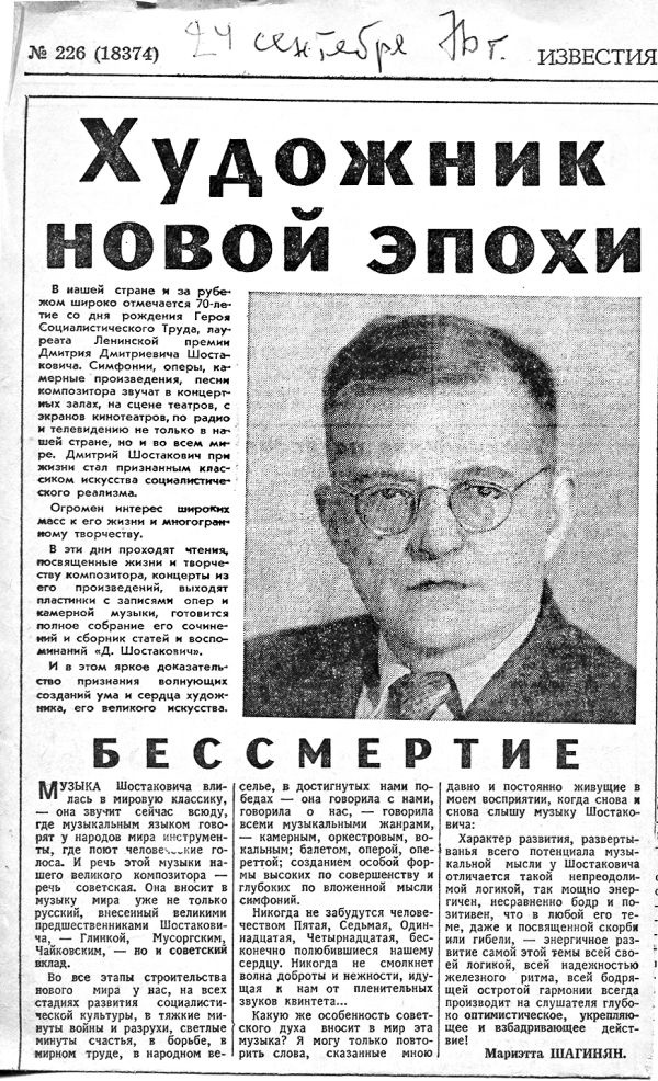А в папочке с еле развязанными мною тесемочками много всего неожиданного. Но не только о музыке и создании "Ленинградской симфонии", об убийственных статьях типа "Сумбур вместо музыки", растаптывающих великого Шостаковича. И не только о встречах с его мамой Софьей Васильевной, много чего о сыне поведавшей.