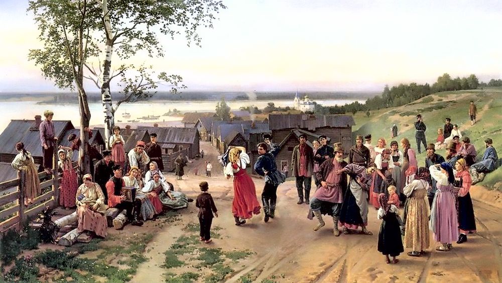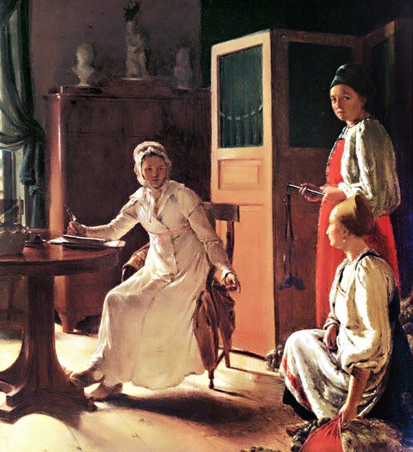 Как-то раз к помещику явились подданные с дарами, с ними - их женщины во всей красе. "Барыня с любопытством все рассматривала и потом... сказала: "У наших крестьян такие нарядные платья и украшения; должно быть, очень богаты и им ничего не стоит платить нам оброк".