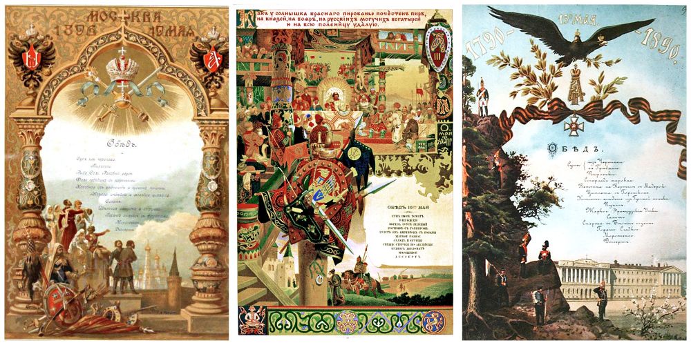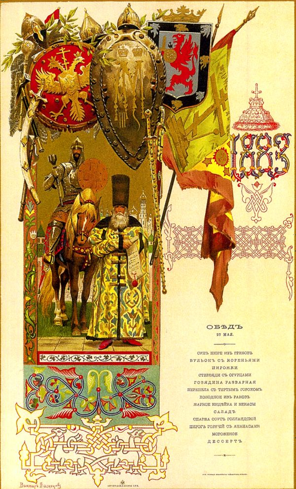Одним из главных авторов стал живописец Виктор Васнецов. Не изменяя своему былинно-сказочному жанру, он создал серию меню с боярами, царским пиром, витязями, с орнаментом в стиле древнерусских рукописей. Такими были "Меню парадного обеда в дни коронации императора Александра III. 27 мая 1883 года", "Обед в честь священного венчания на царство императрицы и государыни Марии Федоровны и государя императора Александра III" (24 мая 1883 года) и "Священное венчание государя императора Александра III и государыни императрицы Марии Федоровны" (май 1883-го).