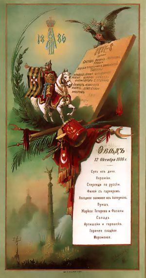 15 мая (по старому стилю) 1883 года состоялась коронация Александра III. Торжества продлились с 8 по 27 мая и сопровождались зваными обедами. Меню к ним оформлялись в модном "русском стиле".
