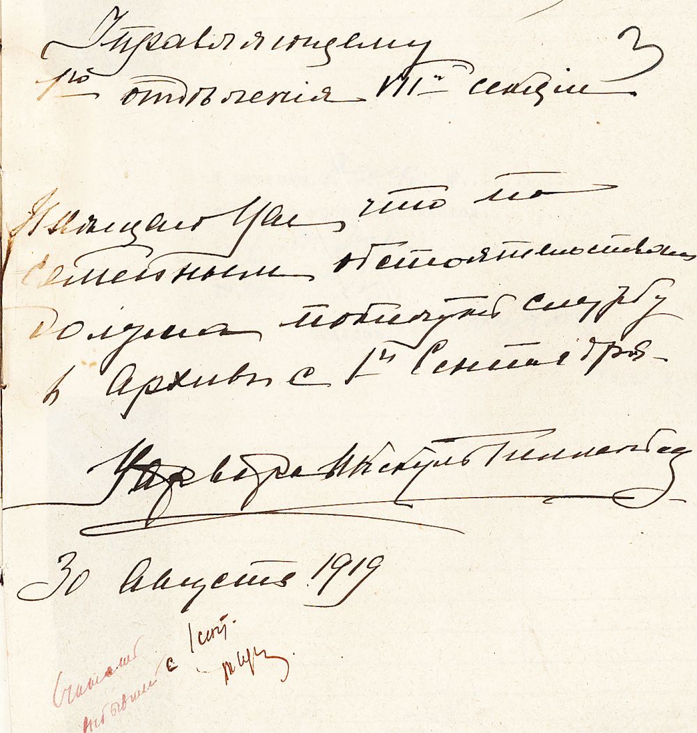 "Управляющему 1го отделения VIIй секции. Извещаю Вас, что по семейным обстоятельствам должна покинуть службу в Архиве с 1го Сентября. Варвара Икскуль-Гильдебрандт 30 августа 1919".