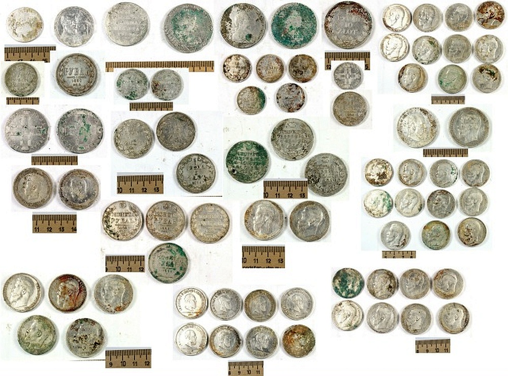 Среди монет клада: полтина 1842 года, монета чистого серебра 4 золотника 21 доля 1817 года, монета 3/4 рубля 5 злотников 1834 и 1836 годов, монета 1 1/2 рубля 10 злотников 1835 года, монеты по 25 и 30 копеек середины XIX века, крестовик 1798 года Полуполтинник (Павел I), крестовик 1798 года рубль (Павел I), рубль 300 лет дому Романовых (1613-1913), рубль 1796 года (Екатерина II), рубль 1733 года (Анна Иоанновна), рубли Николай II.
