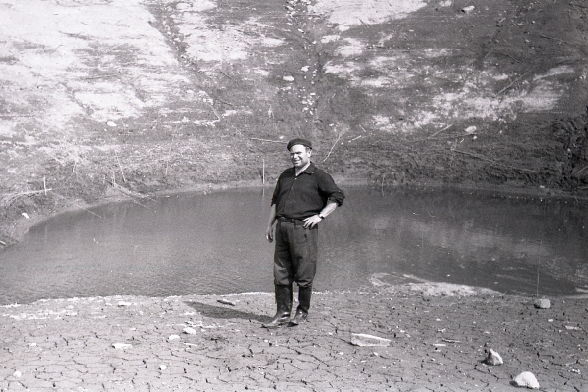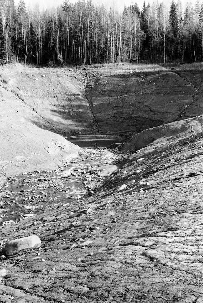 Исследователи полагают, что Шимозеро - это фактически разлившаяся река Кудома. Она вытекает из Долгозера, проходит через Шимозеро и скрывается в Черной Яме. Эта протока хорошо видна ранней весной, когда основная часть озера еще подо льдом. А на снимке из апреля 1977 года житель деревни Пелкасска Матвей Омшев стоит у этой протоки, ведущей в Черную Яму, уже когда снег сошел, в апреле.