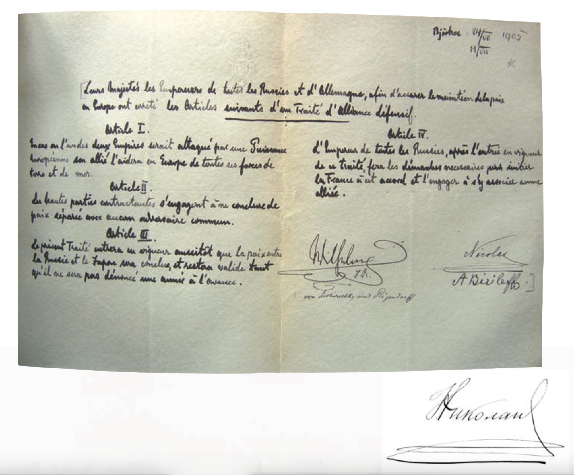 Между тем в указанный день тайное свидание двух венценосцев состоялось, а плодом его стал договор, вошедший в историю дипломатии под названием Бьёркского (11 (24) июля 1905 года). Вступление его в силу после ратификации русско-японского договора о мире грозило существенно изменить расстановку сил на международной арене. Этот договор - явление в анналах дипломатии редкое, если не уникальное, и хотя в силу он так и не вступил, обстоятельства его подписания довольно любопытны как в объективно-фактическом, так и в субъективно-психологическом ракурсах.