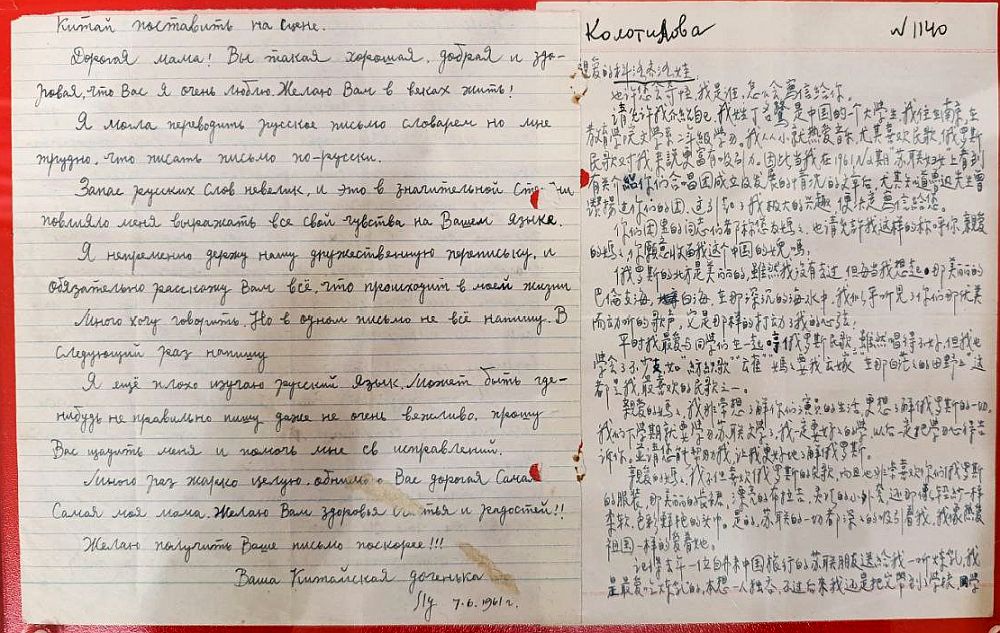 "Все мои друзья завидуют, что я переписываюсь с тобой. Они очень интересуются вашим хором и передают привет. Мама, я очень рада узнать, что ты хотела мне прислать русский наряд. До сих пор я его не получила, может быть, на таможне задержали? Мама, что тебе прислать из Китая? В прошлый раз я прислала тебе несколько известных китайских кустарных изделий, но, к сожалению, они где-то пропали. Узнай, пожалуйста, на почте почему мои письма до тебя не доходят".