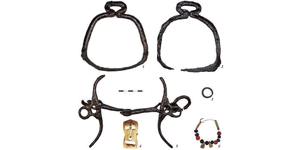 На территории одного из курганов археологи обнаружили захоронение, разделенное перегородкой на два отделения: северное - для погребения человека и южное - для захоронения лошади. В могиле находились останки женщины, у которой не было большей части зубов верхней челюсти - их нашли в разных частях ямы. Исследователи нашли украшения - бусы из слоистого агата и стеклянной пасты, бронзовую серьгу, а также железный нож с деревянной рукоятью.